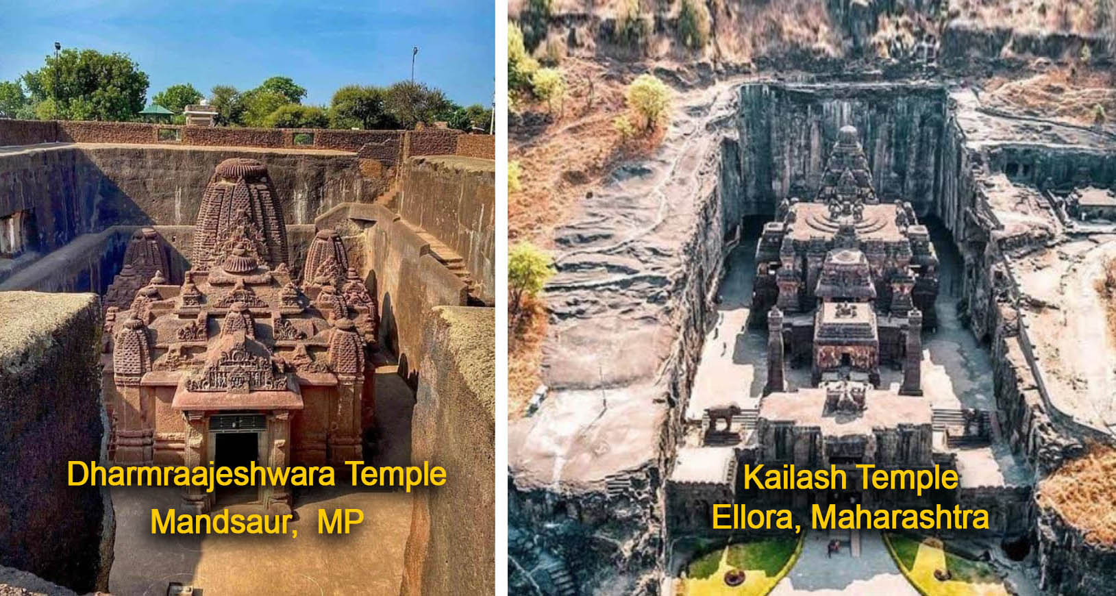 धर्मराजेश्वर अथवा धर्मनाथ मंदिर (Shree Dharmrajeshwara Temple, Madhya Pradesh) की निर्माण शैली लगभग एक समान इसीलिए प्रतीत होती है क्योंकि इन दोनों ही मंदिरों को सामान तकनीक से उसी प्रकार एक ही कठोर पत्थर को ऊपर से नीचे की ओर खोद कर मंदिर का आकार दिया गया है।
